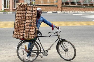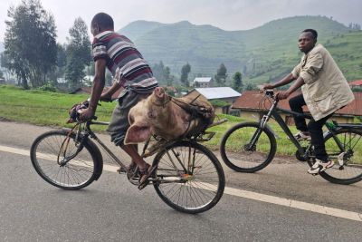 My admiration goes especially to the many cyclists who transport all sorts of things: potato sacks, egg cartons, corn sacks – we even witnessed someone carrying a live pig! No idea how they brake!!! In any case, it is clear to us how crucial bicycles are in Rwanda.